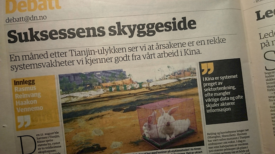 Miljøkatastrofen i Tianjin, Kina for en tid siden har fått mye oppmerksomhet internasjonalt. I Dagens Næringsliv kommenterer Rasmus Reinvang og Haakon Vennemo hendelsen i lys av et prosjekt om forvaltning av miljørisiko.