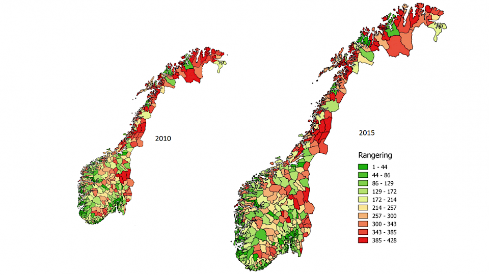 Fallet i oljeprisen har slått ut i årets kommune-NM, som er gjennomført på oppdrag for NHO. Kommunene som har falt mest ligger hovedsakelig på vestlandet. Men endringene er fra et høyt nivå, og fortsatt dominerer kystkommunene sammen med byene toppen av kommunerangeringen. Kommuner med høyere innbyggertall blir systematisk rangert høyere enn kommuner med lavere innbyggertall, for de aller fleste indikatorene.