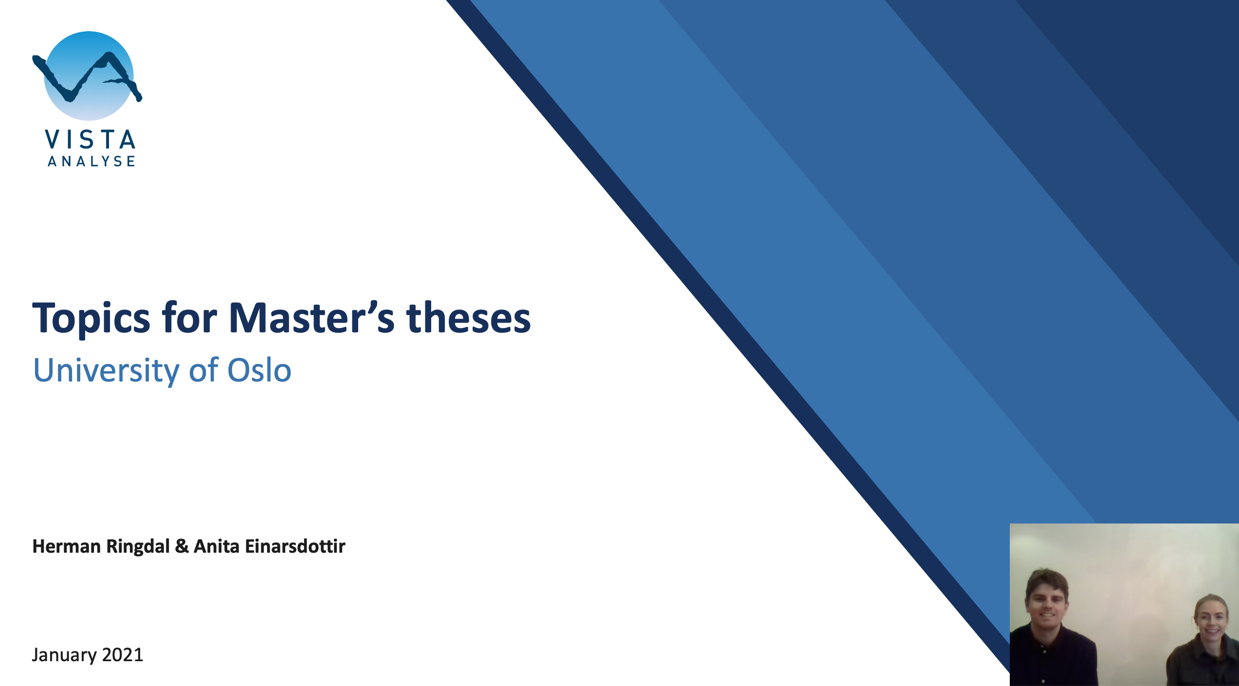 January 2021 Herman Ringdal & Anita EinarsdottirUniversity of OsloTo p i c s f o r M a s t e r ’s t h e s e s © VISTA ANALYSE2•About 30 employees•High professional and academic standards •Extensive experience and expertiseAboutus © VISTA ANALYSEWe offer•Opportunity to participate in highly stimulating academic environment•Office space •Up to three scholarships of NOK 20 000,-each•Deadline May 1st•Short application containing:–Brief project plan–CV–Grade transcriptFor more information: www.vista-analyse.noContact: anita.einarsdottir@vista-analyse.noApplication © VISTA ANALYSE4•Three possibilities:1.Willingness to pay for electricity2.Analyses with a GE-model for Norway3.Make your own suggestionWritinga Master’sthesiswithus © VISTA ANALYSE5•If youwantto writewithinoneofthetwotopicswehave suggested, Haakon or Orvikawillbe yoursupervisor.–Haakon Vennemo, PhD(UiO) and Professor (OsloMet), has strongacademiccredentialsand about40 referee publicationsin journals and books. –OrvikaRosnes, PhD, is an expertin energyand climatepolicy, and has severalpublicationsin refereedjournals and books. •If youwantto design yourowntopic, wewillmatch youwitha supervisor whohas extensiveexperienceand expertisewithinthatfield.–In Vista thereare5 professors, 8 hold a PhD, and 27 economistsWho willbe yoursupervisor from Vista? © VISTA ANALYSE6•Research project (2019-2022):Households’ willingness to pay for security of supply in selected critical functions of the society •A large valuation study–What is households’ willingness to pay for electricity when considering synergies between different sectors? –A black-out that affects not only the household, but also the transport system, ATM, electronic communication, …–Data collection in January-February 2021 •Master thesis:–Analysevarious aspects of willingness to pay, based on the data–Method –E.g.The effect of smartphones and tablets on stated preferences in non-market valuation web surveys: Response validity and practical consequences (Magnus Aagaard Skeie, 2017) 1. Willingness to pay for electricity © VISTA ANALYSE7•CGE-model = computable general equilibrium model –NOREG –a CGE-model for Norway, with a regional dimension •Typical policy analyses with CGE models: –What is the cost of achieving an emission reduction target? –What is the effect of increased oil production in Northern Norway? –What is the effect of establishing a new university in a certain region? … taking into account the interaction between different agents and different industries in the economy •Research focus in 2021-2022: the role of public sector •Master thesis can –Analysea policy issue–Contribute to the model development by estimation of elasticities etc. •Required: interest in quantitative methods (modelling /programming /econometrics) •Reward: better understanding of the Norwegian economy 2. Analyses withCGE-modelNOREG © VISTA ANALYSE8Interesting topics?•Analysewhere the new hospital in Innlandetshould be located •Broader economic impact of the Norwegian renewable energy sector•Implementing incentives for climate resilient housing among the urban poor in Vietnam Monitoring•Cost-Benefit Analysis of climate change adaptation projects•Va l u a t i o n o f e nv i ro n m e nta l d a m a ge s i n Georgia•The relationship between natural resource wealth/production and fiscal transparency3. Make yourownsuggestion © VISTA ANALYSEWe offer•Opportunity to participate in highly stimulating academic environment•Office space •Up to three scholarships of NOK 20 000,-each•Deadline May 1st•Short application containing:–Brief project plan–CV–Grade transcriptFor more information: www.vista-analyse.noContact: anita.einarsdottir@vista-analyse.noApplication Meltzersgate 4, 0257 Oslo | +47 47302032 | anita.einarsdottir@vista-analyse.no| www.vista-analyse.noVista Analysis is a social science consultancy with its main emphasis on economic research, policy analysis and advice, and evaluations. We carry out projects to the highest professional standards, with independence and integrity. Our key thematic areas include climate change, energy, transport, urban planning and welfare issues.